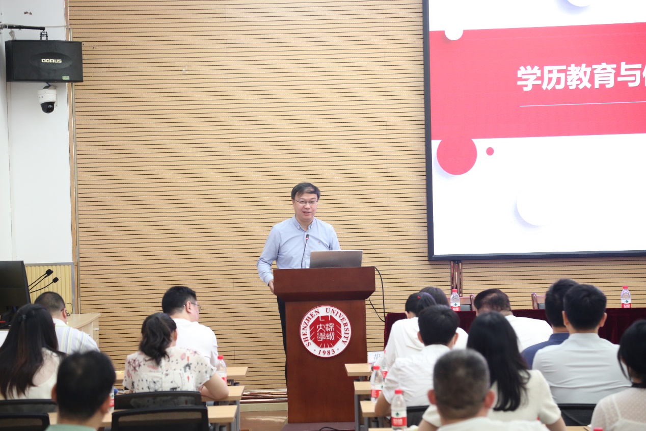 最后,李伟文院长汇报学院十四五规划及近期工作安排情况。在发言中,他首先对学院历届班子成员和全院教职员工的辛勤付出表示衷心感谢,作为继续教育学院的“排头兵”,深感责任重大,使命光荣,他表示,继续教育学院今天的成绩离不开历届班子成员的努力,新班子必须在秉承优良传统基础上,思考如何再出发,继续开拓创新,让每位教职工对学院真正地具有“荣誉感”“归属感”,齐心协力地为之奋斗,这也是全院大会的意义所在。针对我院目前的存在的问题和未来发展方向,他从发展目标、中长期规划、总体定位三大方面做出部署,强调我院要秉持立德树人宗旨,传承红色基因,弘扬特区精神,围绕学校创建世界一流创新型大学目标,抢抓机遇,聚焦问题,探索新路,建成在全国有较高影响力的高等继续教育先行示范基地。发言最后,李伟文院长对暑期工作安排和下半年学院的重点工作进行了动员部署。