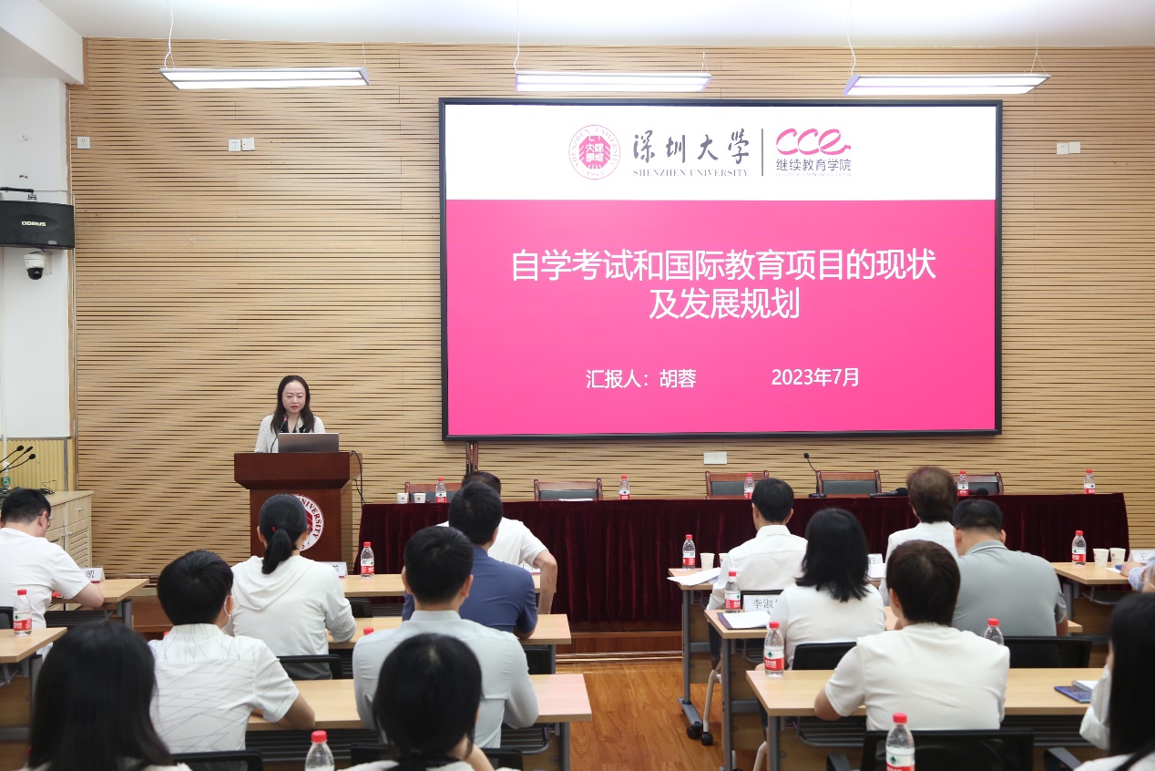 会议第二阶段,学院分管院领导就各自分管工作做主题报告。胡蓉副院长汇报自学考试与国际项目发展思路,分析了我院自学考试项目和国际教育项目发展面临的新要求、新形势,系统总结了项目的专业设置、师资情况、办学效益等方面的现状,明确了存在的问题,并为两块业务下一步高质量发展提出规划与对策:从办学规模质量、团队建设管理、信息化服务完善、教学资源融合四大方面深耕建设,加强内涵发展,提升辐射影响力。