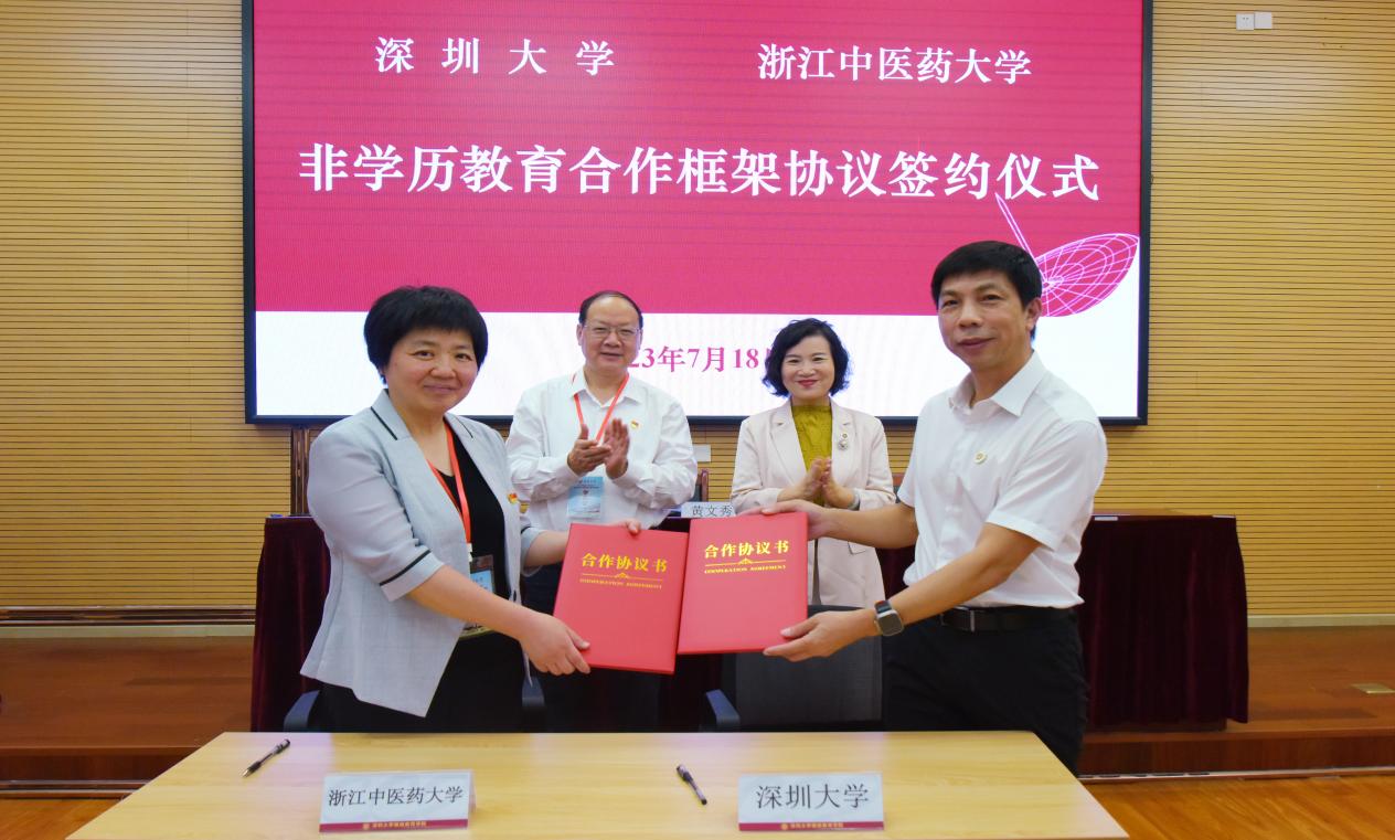 开班仪式上,浙江中医药大学组织部部长黄爱军、深圳大学继续教育学院院长李伟文分别作为两校代表,签署了双方非学历教育合作框架协议,进一步促进两校交流合作,推进高等教育事业高质量发展。