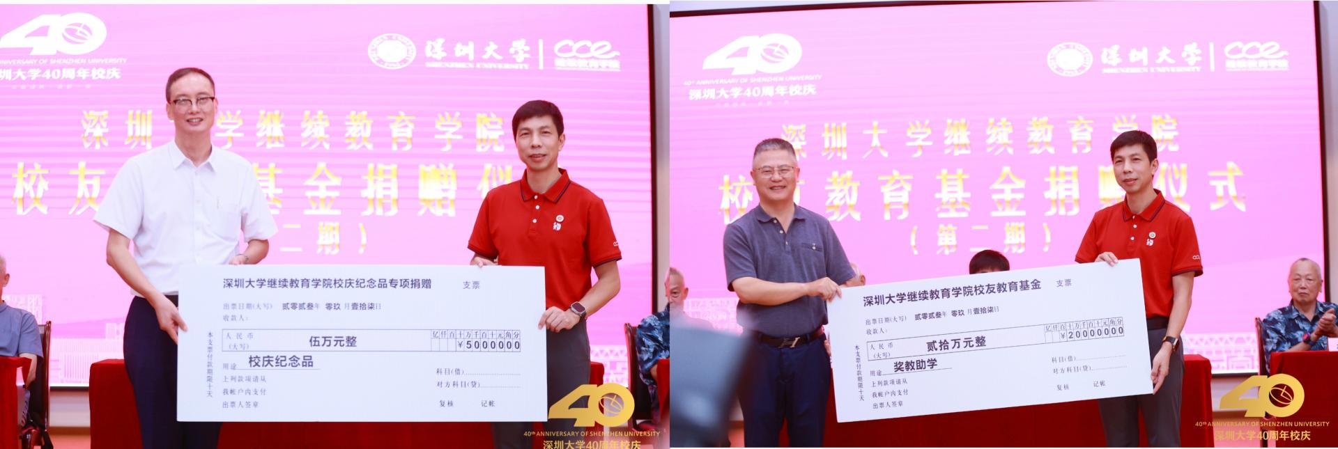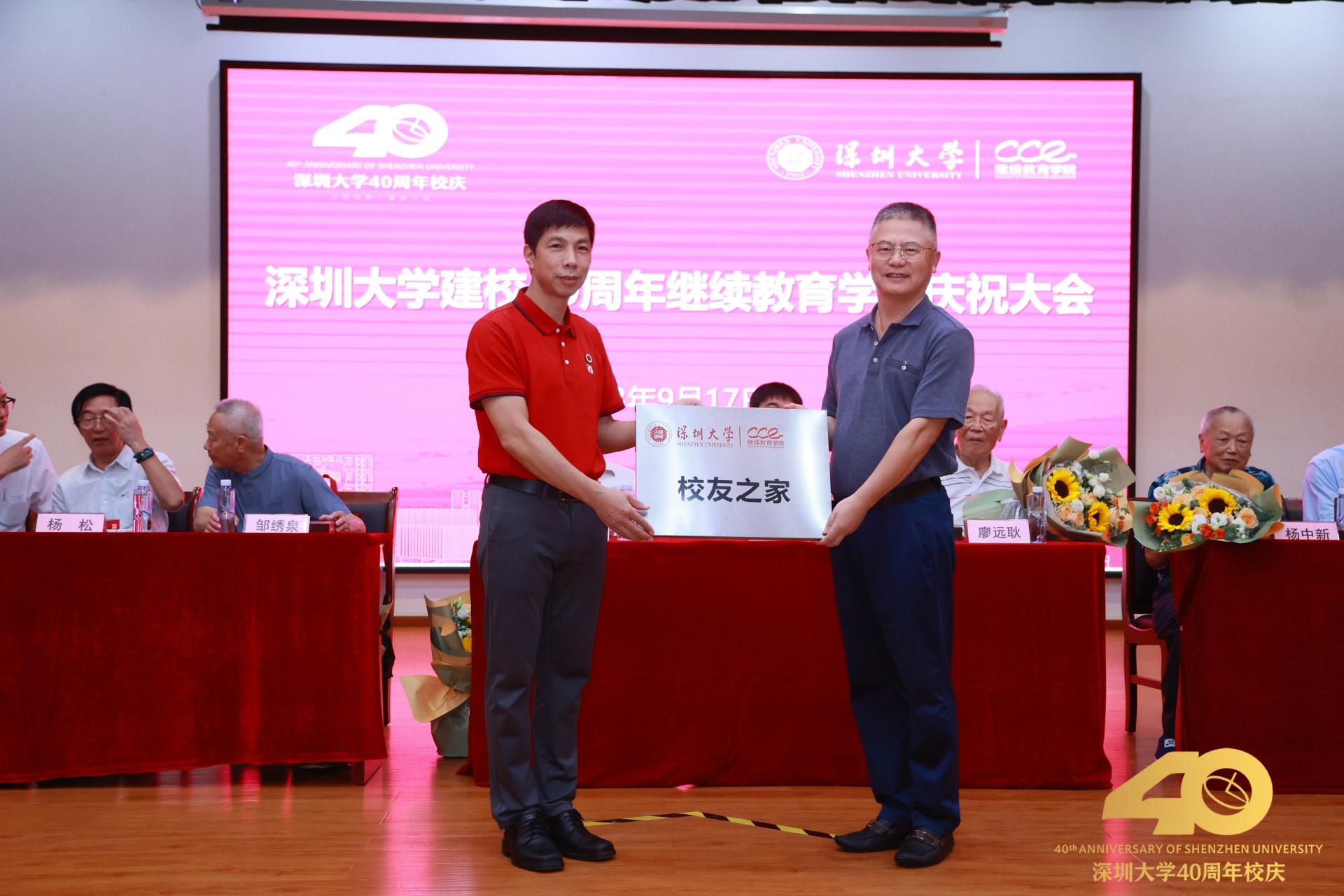 上午10点30分,深圳大学建校40周年继续教育学院庆祝活动在B座二楼演会中心举行,大会由继续教育学院党总支陈志行书记主持。继续教育学院李伟文院长代表学院致辞,李伟文院长回顾了学院办学40年走过的发展历程和取得的发展成就,对各个时期为继续教育事业竭诚奉献的师生员工、广大校友、各界朋友等表示衷心的感谢。祝福深圳大学40岁生日快乐,祝福大家中秋、国庆双节快乐;在校学生代表2021级专升本会计学专业叶柳同学代表学生发言,感谢母校辛勤培育和老师的悉心教导,表示向优秀的校友学习,努力成为母校的骄傲;校友理事会饶江山会长代表校友讲话,他表达了对母校的怀念和感恩,表示和校友理事会成员一起尽心尽力做好校友工作,为母校的发展贡献更多的力量。接着,举行了校友捐赠仪式。校友理事会饶江山会长和张明秘书长,代表学院校友会分别向学院捐赠校友教育基金和校庆纪念品专项款,李伟文院长代表学院接收捐赠;之后,进行校友个人捐赠证书颁发仪式,陈志行书记宣读捐赠校友名单,李伟文院长为捐赠校友颁发证书。