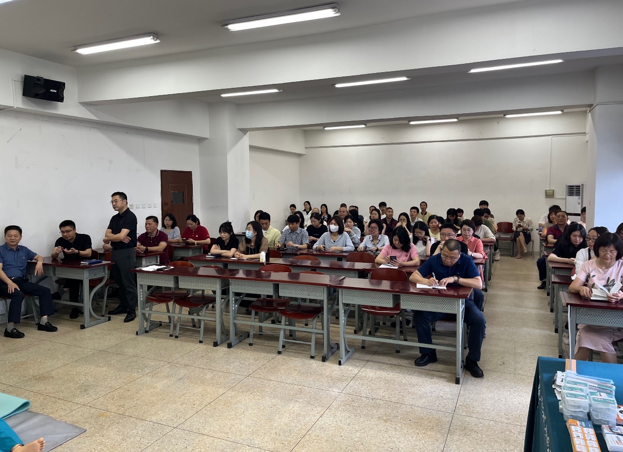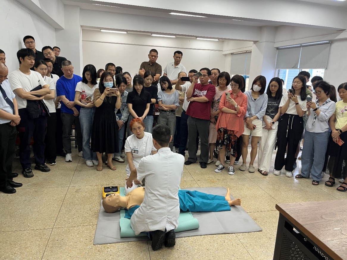 讲座现场,敖山水医师详细介绍了急救的基本原则、常用急救方法和急救器材的使用方法。过程中,敖医师分步骤、慢动作演示全套操作流程,包括如何调整体位、打开气道、人工呼吸、胸外心脏按压等急救法。随后,他邀请在场老师现场模拟操作,让老师们更加深入地了解急救技能的实际操作和应用。