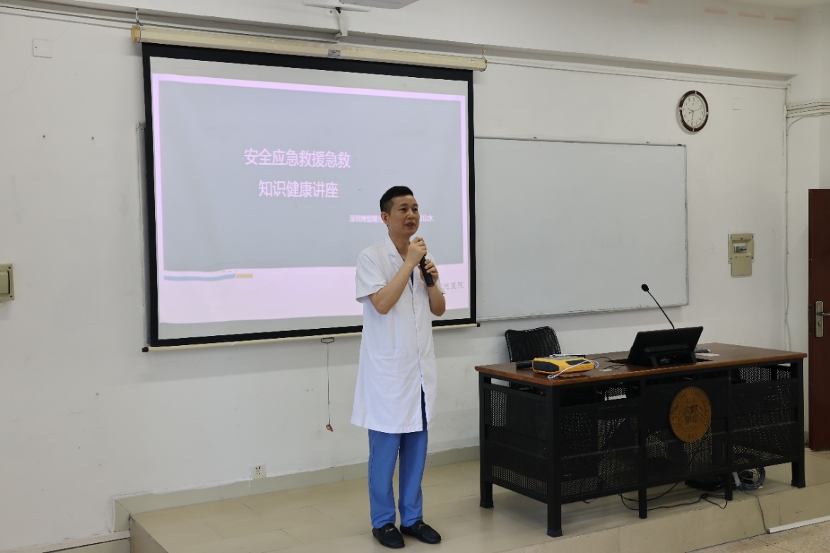 在第16个全国防灾减灾日来临之际,为深入贯彻落实《广东省减灾委员会办公室2024年全国防灾减灾日活动方案》精神,提高教职工应急救护意识和自救互救能力,深化平安校园建设,5月10日上午,继续教育学院后勤保障部在红村社区工作站的支持下,举办了一场安全急救知识培训活动。此次培训邀请深圳博爱曙光医院的敖山水医师担任主讲,全院教职工参加培训,讲座由刘子华副院长主持。