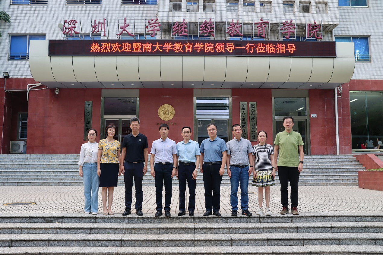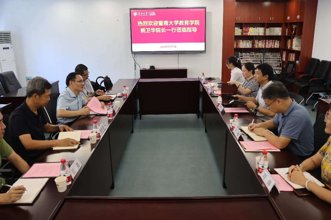 5月29日, 暨南大学教育学院院长熊卫华、副院长曾牧等一行4人莅临我院调研交流,深圳大学继续教育学院院长李伟文、副院长王楠、胡蓉等热情接待。双方在学院A座初心楼1002会议室举行交流座谈会,旨在加强两院之间的交流与业务联系,一起探讨继续教育领域的发展趋势、面临挑战和创新实践,共同推动继续教育事业的进步。