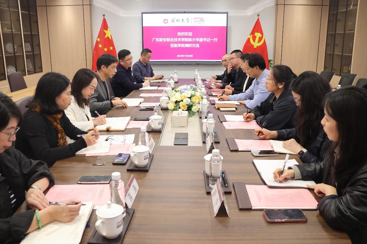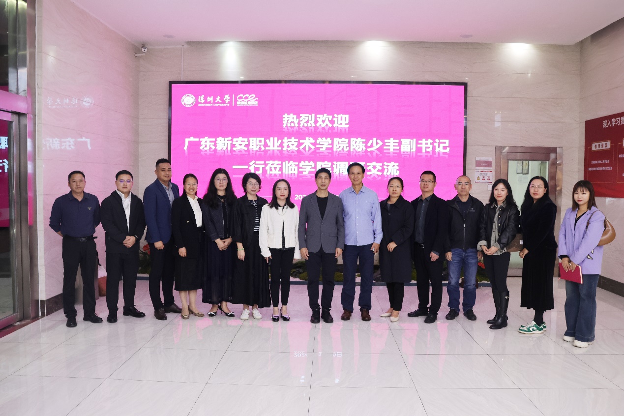 11月20日,广东新安职业技术学院副书记陈少丰一行11人莅临我院调研交流,深圳大学继续教育学院院长李伟文、副院长胡蓉及相关部门负责人等热情接待,双方在学院A座初心楼1002会议室举行交流座谈会。