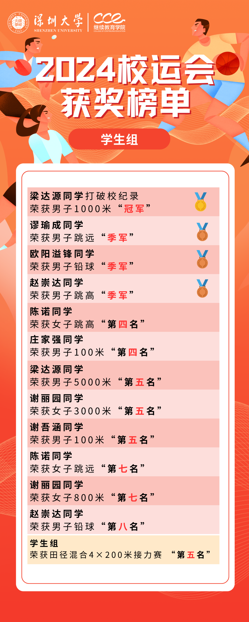 近日,2024年深圳大学校运会在粤海校区元平体育场精彩绽放,赛场上,我院师生以饱满的热情和昂扬的斗志,积极参与各项赛事,奋力拼搏,最终斩获多项荣誉,充分展现了我院师生的风采与实力。