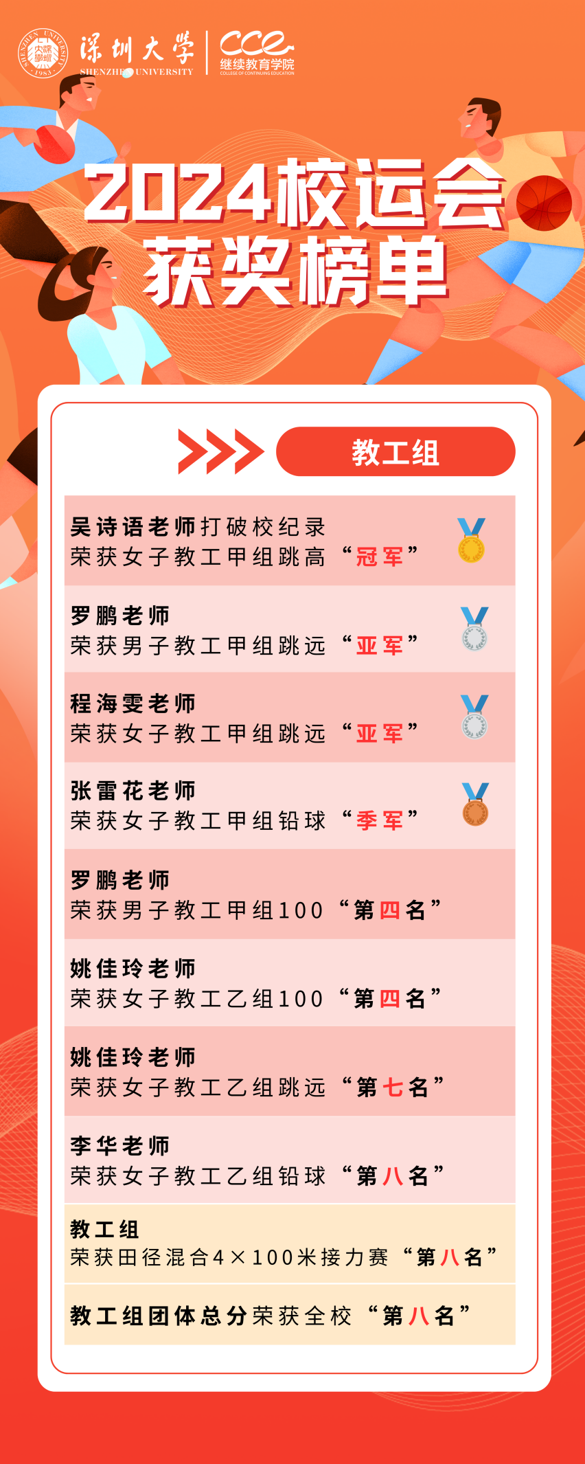 继教院的师生们以无比的热情和高昂的斗志,积极投身于各项竞技与趣味项目中。最终,我院教工组团体荣获全校第八名的佳绩;同时,吴诗语老师与梁达源同学更是凭借出色表现,成功打破校运会记录!