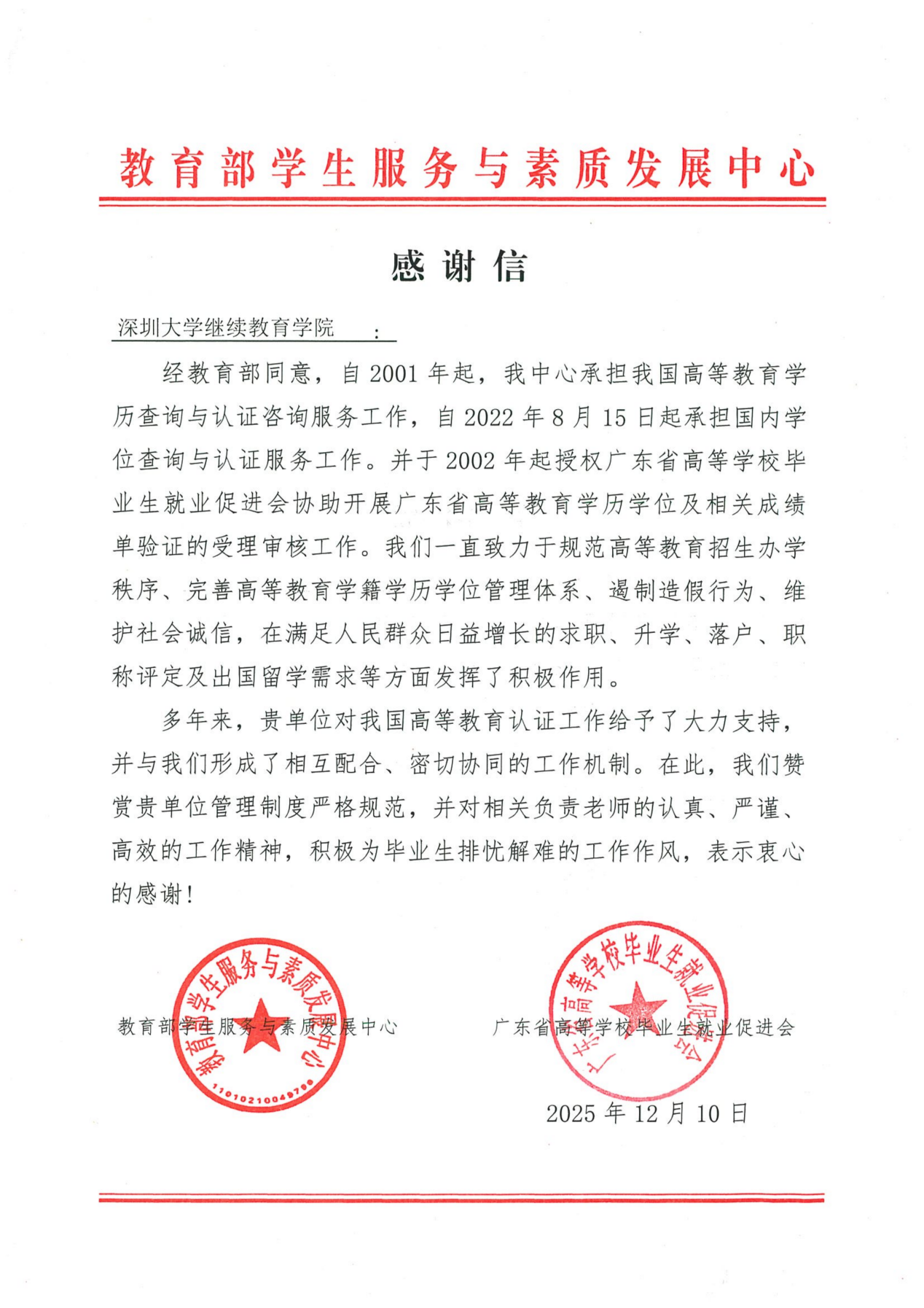 近日,深圳大学继续教育学院收到教育部学生服务与素质发展中心与广东省高等学校毕业生就业促进会联合发来的感谢信,对我院在高等教育学历学位认证领域作出的重要贡献表示高度赞扬与衷心感谢。