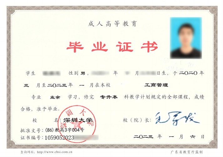 5.毕业:凡被深圳大学正式录取,按规定修完专业教学计划的全部课程且考核合格者,由深圳大学颁发“成人高等教育毕业证书”,毕业证书可在教育部指定的“中国高等教育学生信息网(www.chsi.com.cn)”查询,国家承认学历。