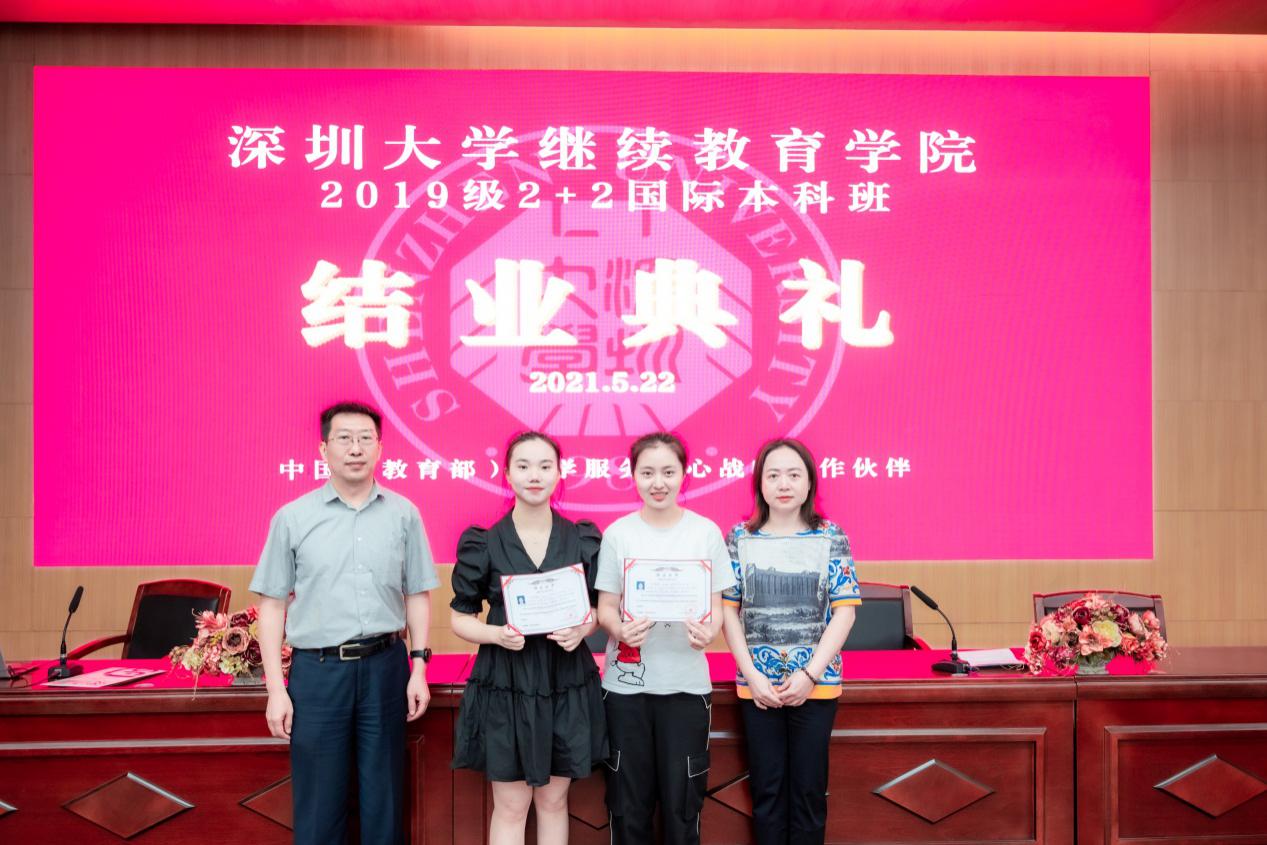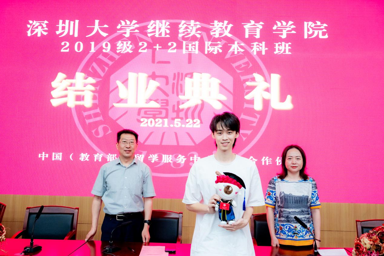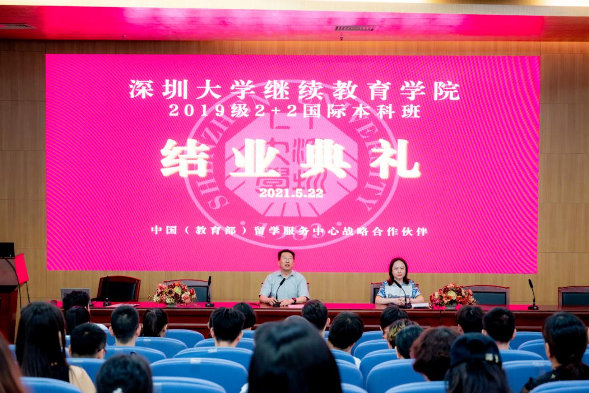 2021年5月22日,2+2国际本科项目2019级结业典礼在深圳大学南图报告厅圆满举行,全体2019级结业学生和家长参加了典礼。继续教育学院院长杜龙,副院长胡蓉出席了结业典礼,给学生颁发了结业证书和纪念品,并给学生带去了殷切嘱托和美好祝愿。