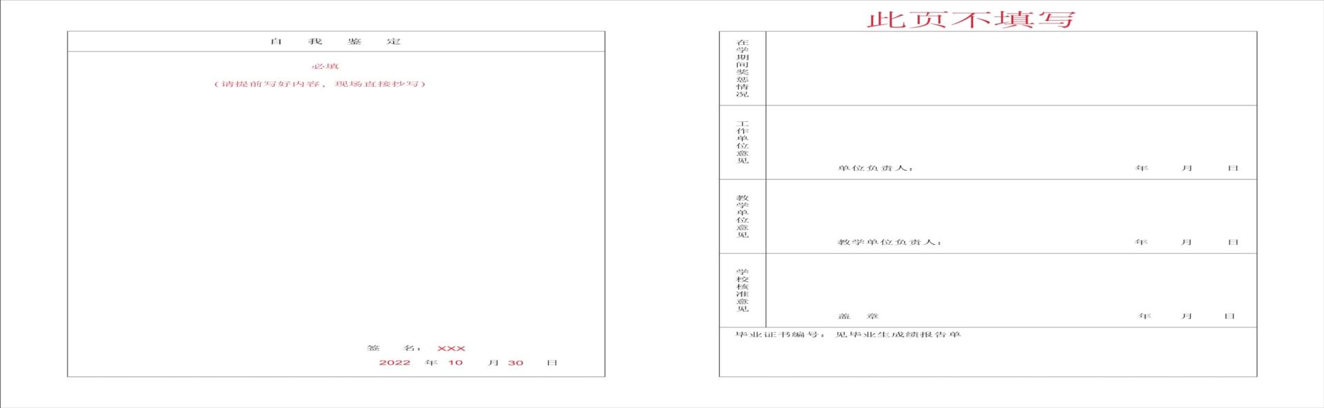 (5)毕业生登记表自我鉴定必须填写,不得留空。(自我鉴定须提前准备好内容,现场誊抄),自我鉴定右下角必须签名,填写日期,不得留空。
