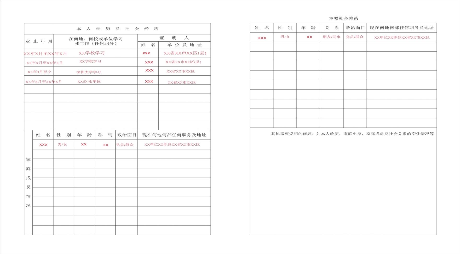 e.主要社会关系:指与本人关系密切的亲友。必须填写,不得留空。