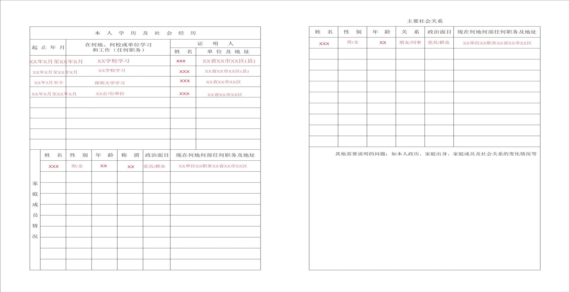 d.家庭成员:指直系亲属,如父母、配偶、兄弟姐妹、子女,如实填写,不得留空。