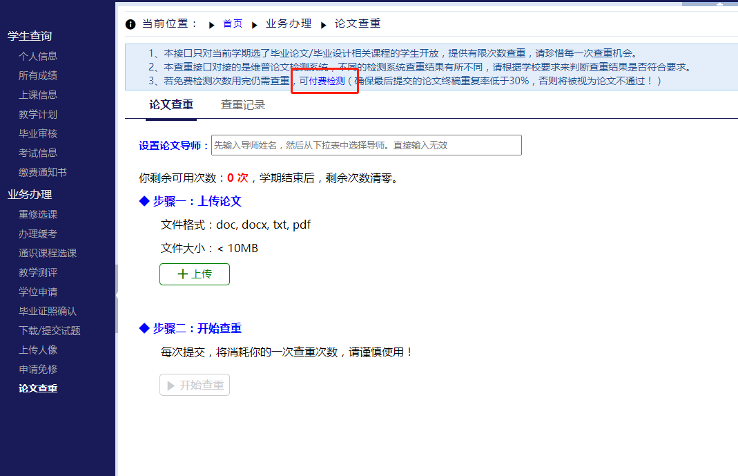 3. 若免费检测2次后论文重复率仍未达到要求,请点击“论文查重”功能页面的付费检测链接进行检测(如下图,付费检测不消耗查重次数,可多次使用)。