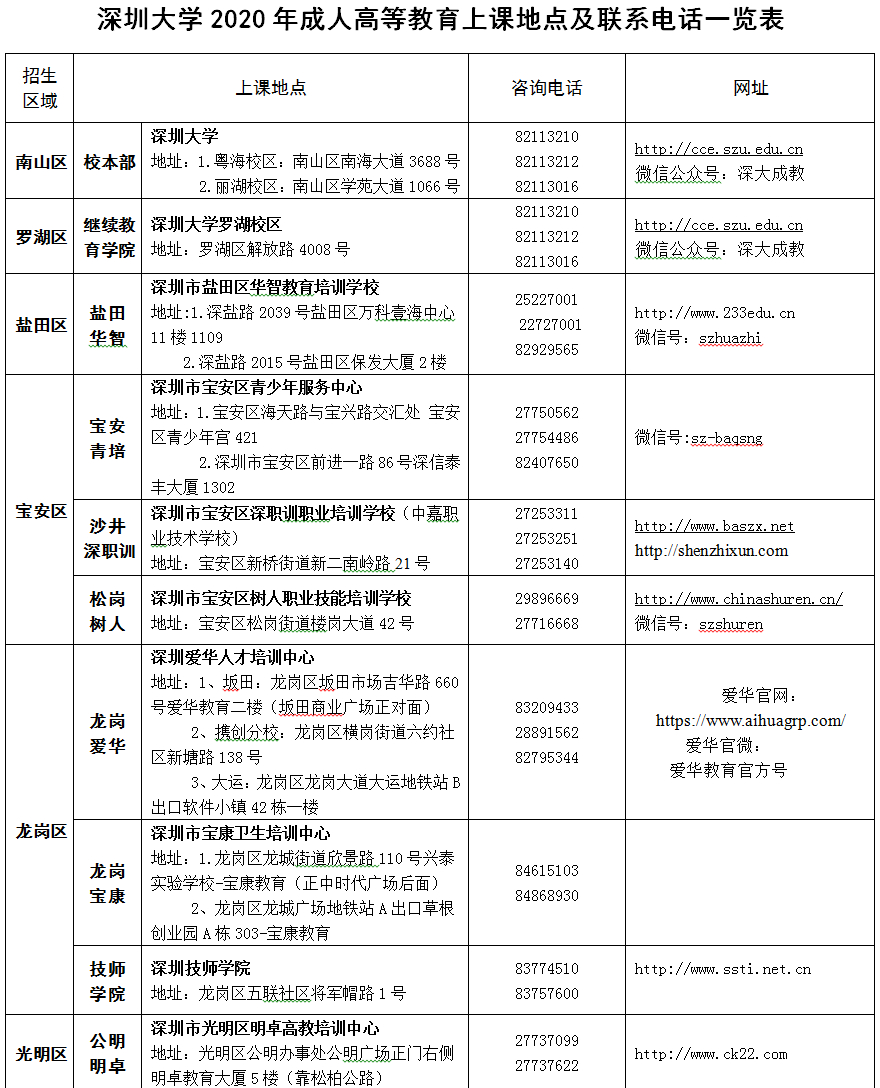 深圳大学2020年成人高等教育高中起点专科拟招生专业及上课地点一览表