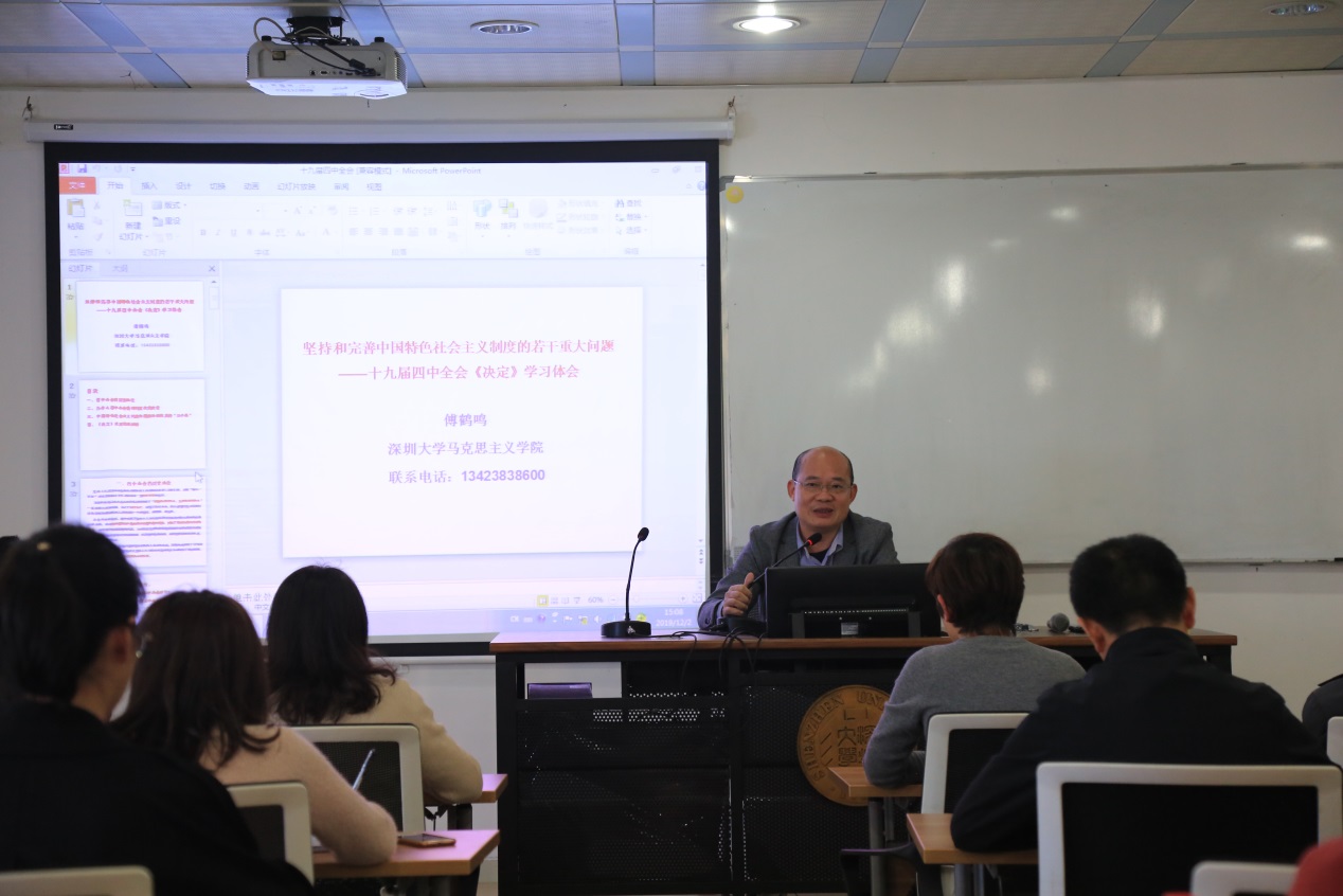 首先,王瑜传达了《深圳大学关于深入学习宣传贯彻党的十九届四中全会精神的通知》,强调了学习的总体要求、总体目标和学习重点。接着,傅教授以《坚持和完善中国特色社会主义制度的若干重大问题——十九届四中全会《决定》学习体会》为题,从四中全会的历史地位、制度体系建设的重大意义、中国特色社会主义制度和国家治理体系的“三个是”、《决定》重要思想等四个方面全面、深入地阐释了全会精神。傅教授的宣讲报告依据事实、引经据典、深入浅出,有很强的思想性、针对性、指引性和感染力,对全体教职工认真学习和深刻把握党的十九届四中全会精神,提供了非常有益的指导。