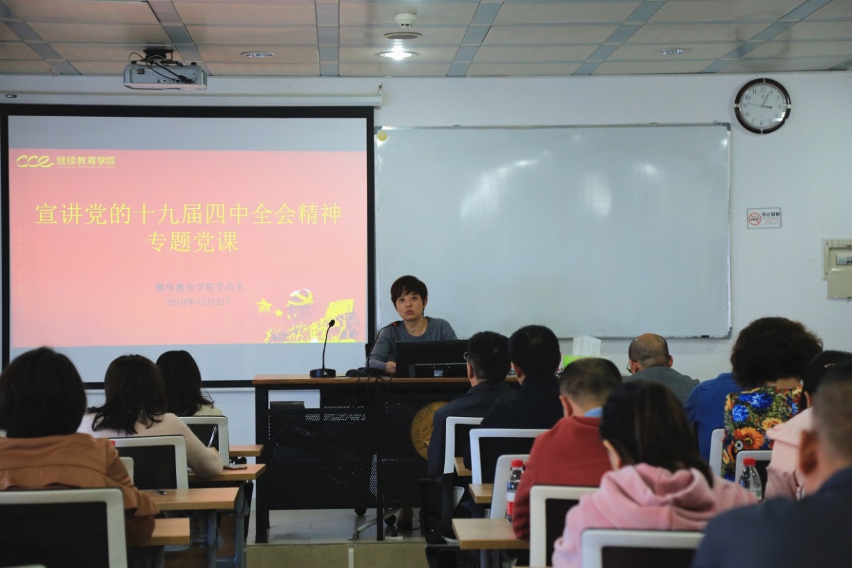2019年12月2日下午,继续教育学院在A703举行学习贯彻党的十九届四中全会精神主题宣讲报告会,会议邀请了我校宣讲团成员、马克思主义学院院长傅鹤鸣教授做主题宣讲。宣讲会由党总支书记王瑜主持,全体教职工参加。