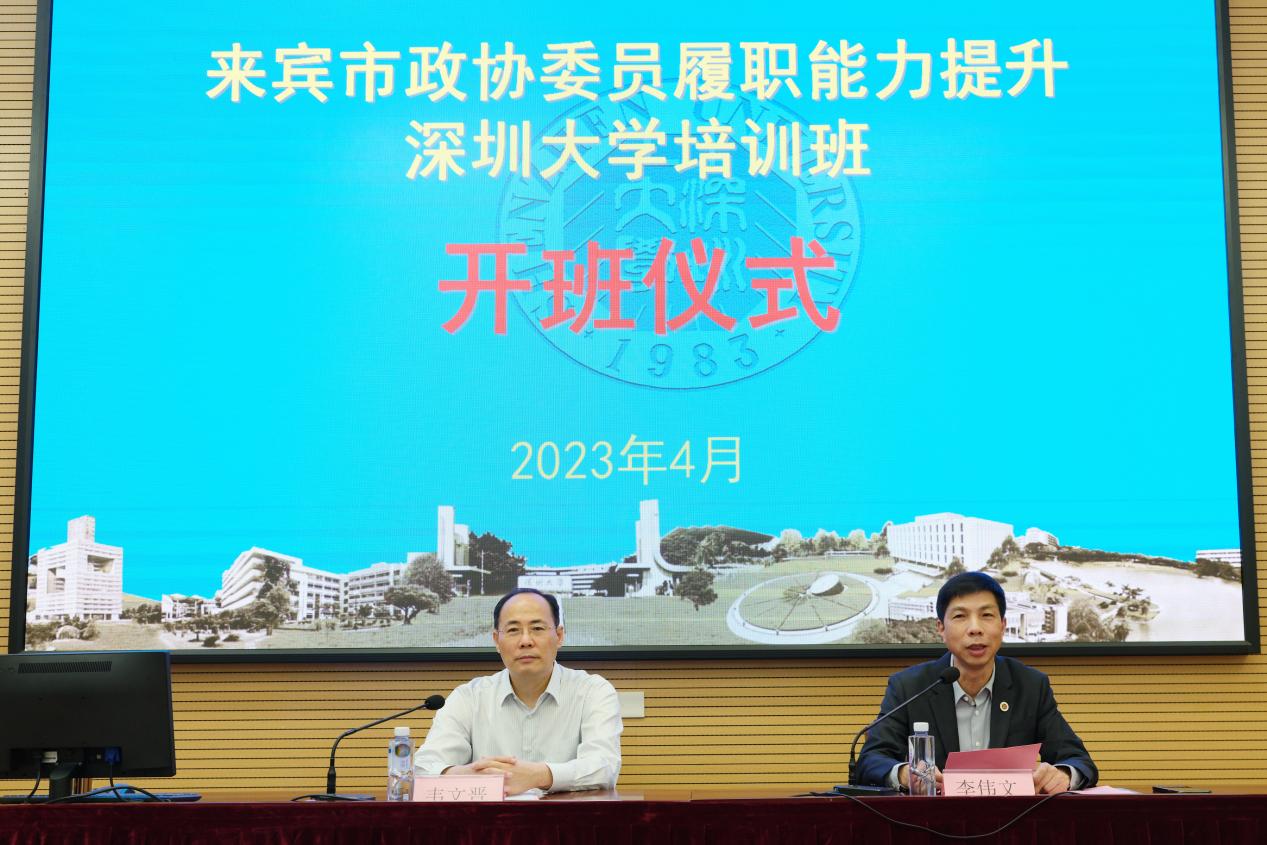 4月11日上午,培训班举行开班仪式,来宾市政协主席、党组书记韦文晋,深圳大学继续教育学院院长李伟文出席开班仪式。