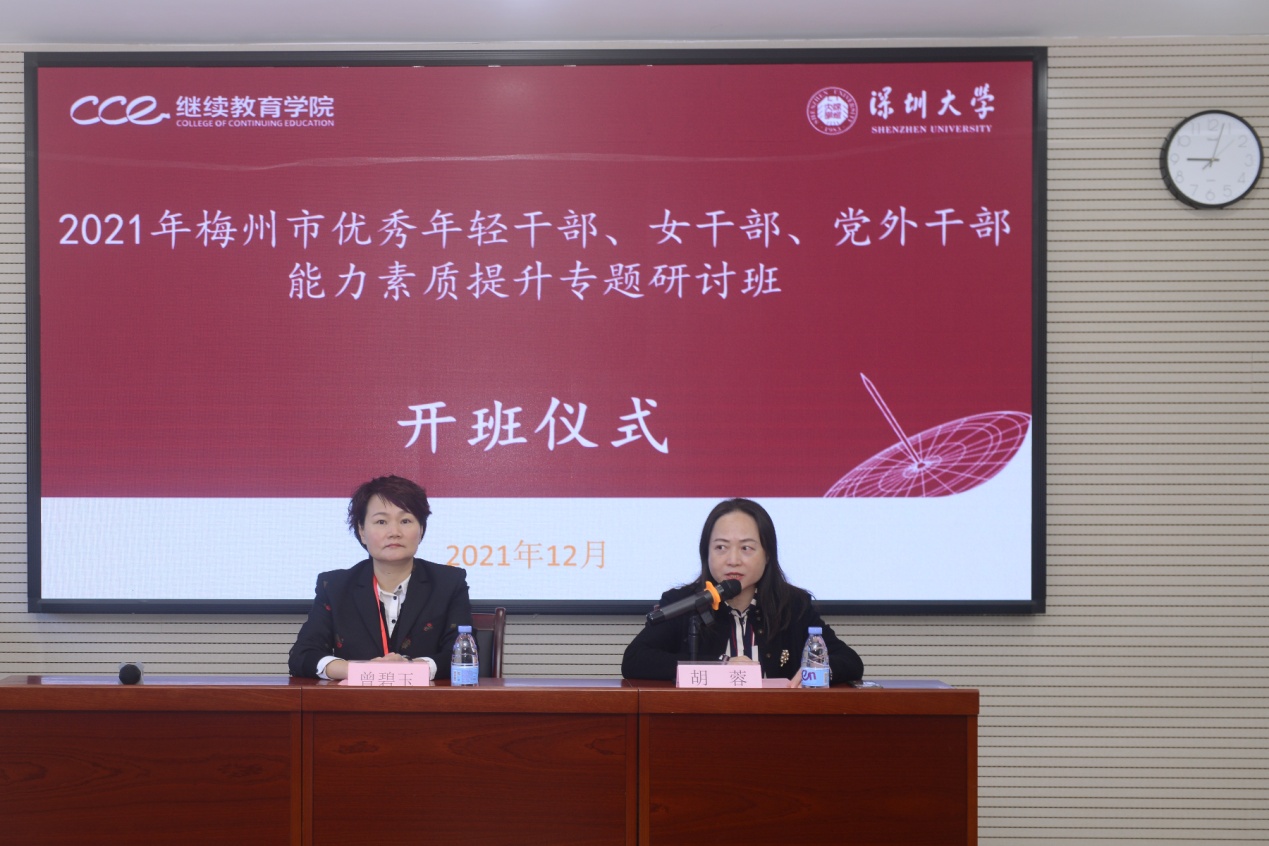 12月6日上午,培训班举行开班仪式,梅州市妇女联合会党组书记、主席、一级调研员曾碧玉、深圳大学继续教育学院副院长胡蓉出席开班仪式。胡蓉代表深圳大学致欢迎辞,对各位学员的到来表示热烈欢迎,并介绍了深圳大学的建校历程、办学特色、知名校友等情况,并预祝本次培训圆满成功。曾碧玉作开班动员讲话,对本期培训班提出三点要求:一是珍惜学习机会,把课程所学更好地应用于工作岗位;二是学、思、悟,知行合一;三是严格遵守学校规定和中央八项规定,疫情期间做好防护注意出行安全。