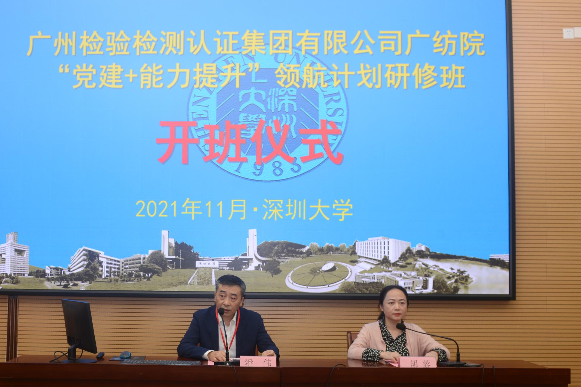 11月19日下午,培训班举行开班仪式,广检集团党委委员、副总经理、广纺党委书记潘伟、深圳大学继续教育学院副院长胡蓉出席开班仪式。胡蓉代表深圳大学致欢迎辞,对各位学员的到来表示热烈欢迎,并介绍了深圳大学的建校历程、办学特色、人才培养、知名校友等情况,并预祝本次培训圆满成功。潘伟作开班动员讲话,先后从三个方面对培训学员提出要求:一是思想上高度重视,要充分认识到此次培训班的重要意义;二是学习上珍惜机会,联系工作实际确保培训取得实效;三是行动上严格遵守各项纪律规定,做好培训期间的疫情防护和个人安全工作。