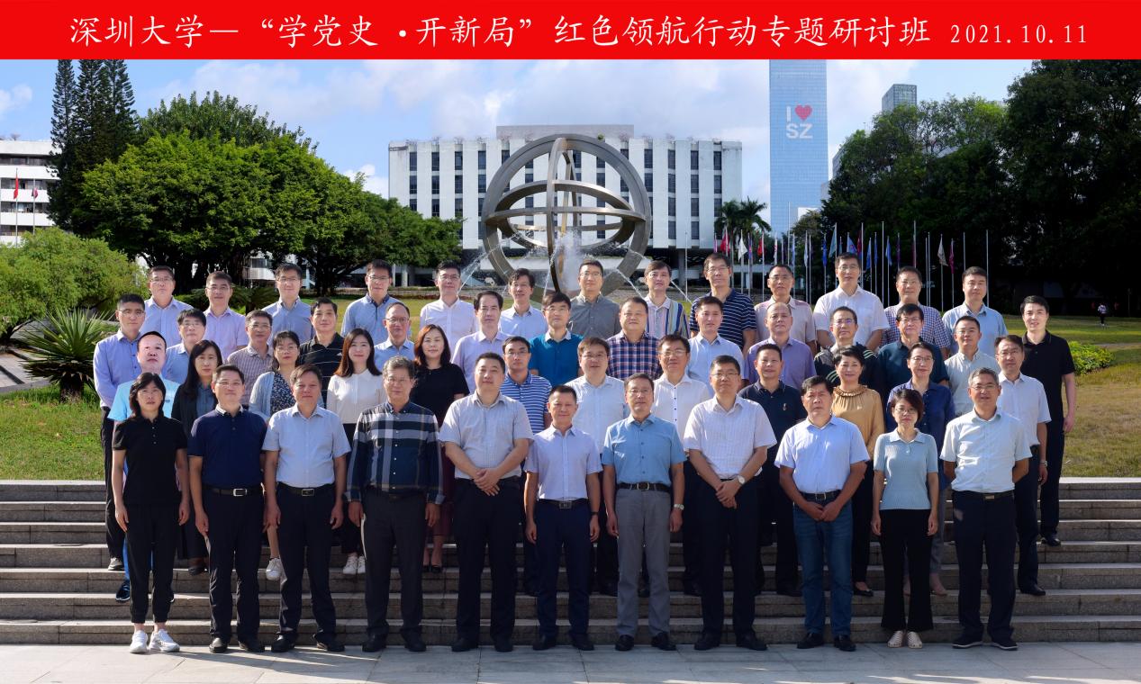 2021年10月9日至10月13日,镇江市润州区“学党史·开新局”红色领航行动专题研讨班在深圳大学粤海校区成功举办, 润州区各机关单位共50位学员参加此次培训。10月11日上午,带队领导区委常委、组织部部长梁亮,区委组织部常务副部长、一级主任科员徐文军,深圳大学继续教育学院副院长郑志平与培训班全体学员开班合影。
