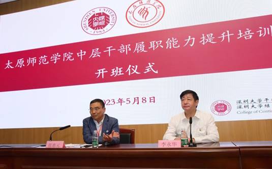 5月8日上午,培训班举行开班仪式,太原师范学院党委书记张惠元,太原师范学院党委副书记赵怡,太原师范学院纪委书记张晓红,太原师范学院党委常委、副校长狄利民,深圳大学副校长李永华出席开班仪式,深圳大学继续教育学院院长李伟文主持开班式。