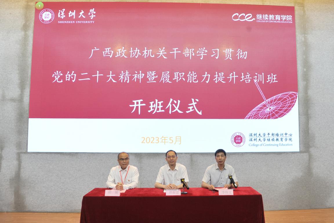 5月22日上午,培训班在粤海校区汇星楼科二报告厅举行开班仪式,广西壮族自治区政协经济委员会专职副主任唐振富,广西壮族自治区政协农业和农村委员会专职副主任招展,深圳大学继续教育学院院长李伟文出席开班仪式。