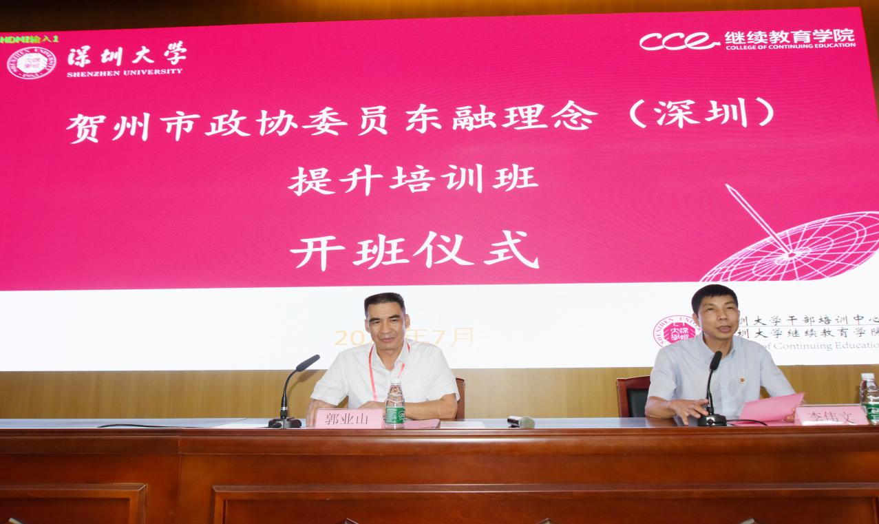 7月25日上午,培训班举行开班仪式,贺州市政协副主席、党组成员郭业山,深圳大学继续教育学院院长李伟文出席了开班仪式。