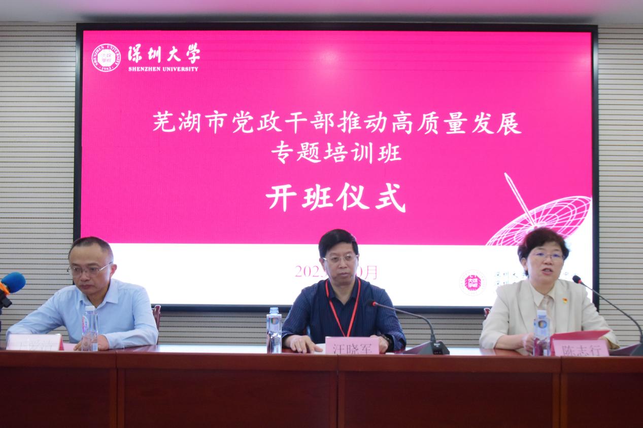 汪晓军作开班动员讲话,首先向深圳大学各位领导和老师表示衷心感谢!向参加本期培训的各位学员表示诚挚问候!同时向学员提出了两点希望和要求:一是要全神贯注谋发展。要抓紧“黄金期”高质量发展,在发展规划上提前筹谋,专注于项目实施,努力在发展之路上奋勇拼搏,拼尽全力。二是要全力以赴抓要求。要牢固树立“高质量、高要求、高素质”的发展鲜明导向,高标准、高效率推进芜湖市发展。
