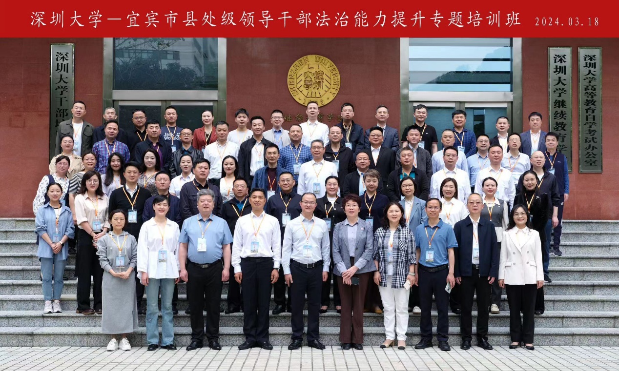 3月18日至3月22日,宜宾市县处级领导干部法治能力提升专题培训班在深圳大学继续教育学院成功举办,共计63位学员参加培训。宜宾市委依法治市办主任、宜宾市司法局局长杨国庆,宜宾市委党校经研所所长石磊,深圳大学继续教育学院党总支书记陈志行出席开班式。