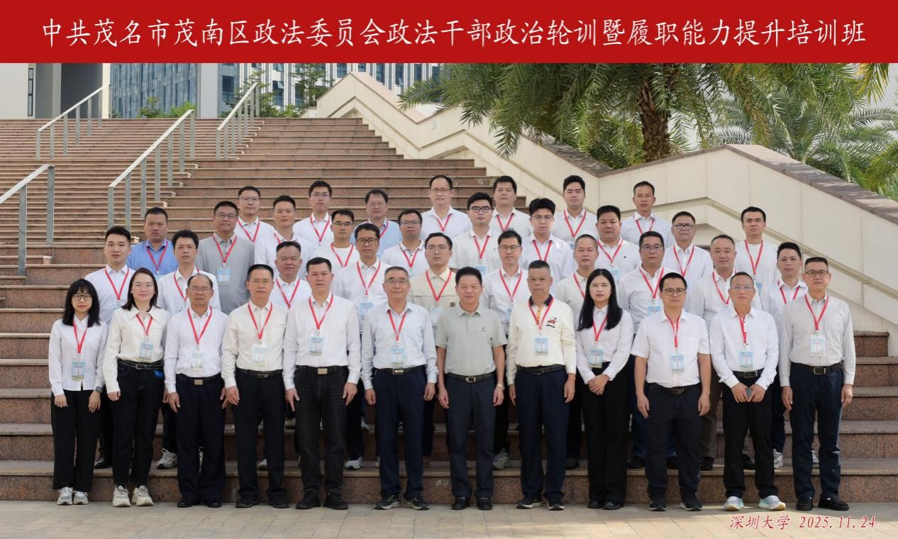 11月24日至27日,2025年中共茂名市茂南区委政法委员会政法干部政治轮训暨履职能力提升培训班在深圳大学沧海校区举办,共计40位学员参加培训。茂南区委政法委员会常务副书记、三级调研员沈雁鹏,深圳大学继续教育学院副院长刘子华出席开班式并讲话。