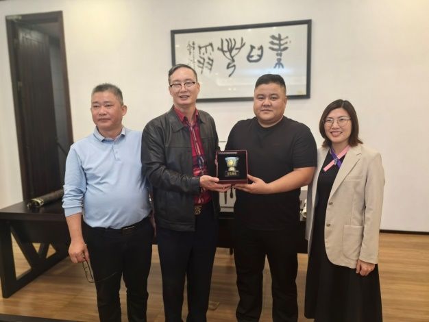 座谈环节中,校友会秘书长张明、副秘书长林贻行代表分会向叶飞总经理赠送了校友会纪念品,并向陈薇羽校友赠予书法作品“自强不息,追求卓越”,以感谢二位对本次走访活动的精心安排与诚挚招待。