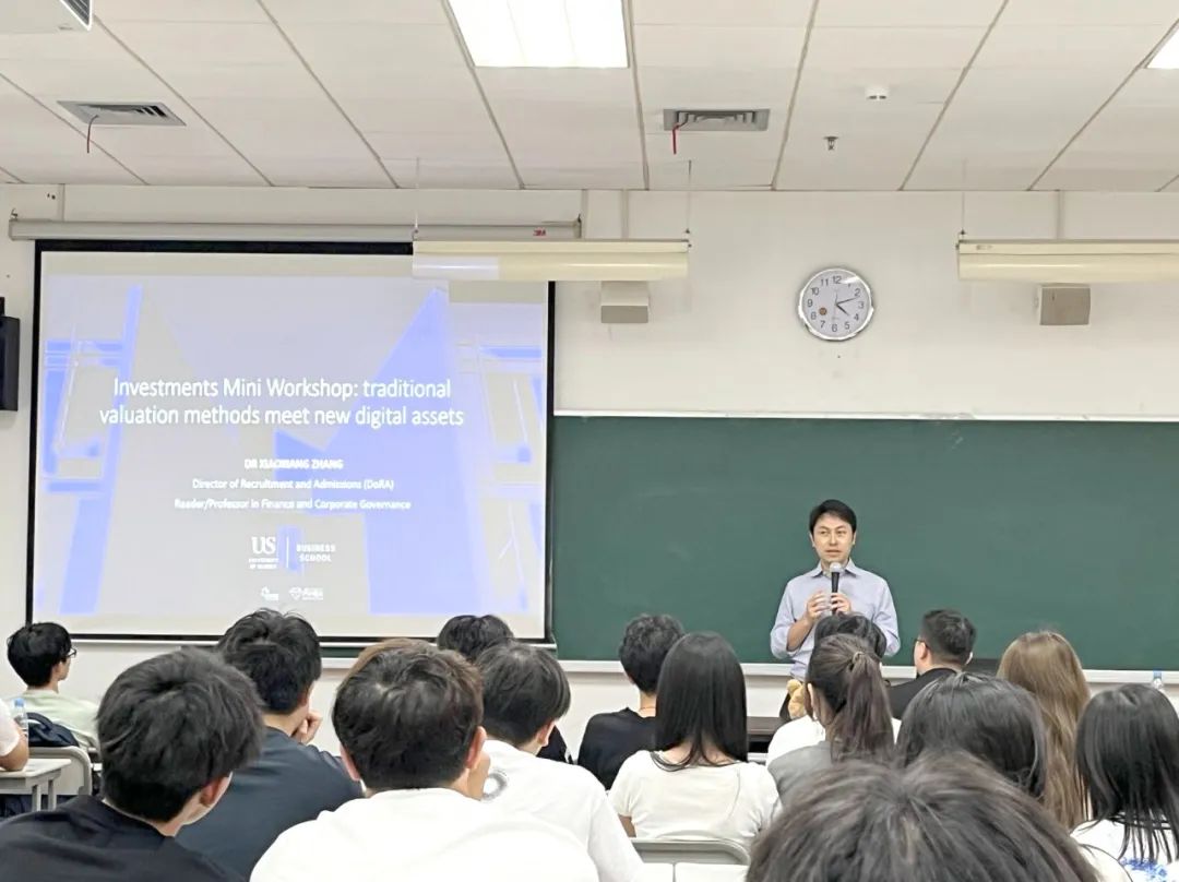 张教授分享的主题是“traditional valuation methods meet new digital assets”。在这个数字化时代,传统的估值方法如何应用?张教授通过案例分享,结合数字资产领域的特点,利用财务指标来评估数字资产所代表的实际价值,以及其背后的商业模式和盈利能力。张教授生动的讲解让同学们提前感受国外院校课堂魅力。