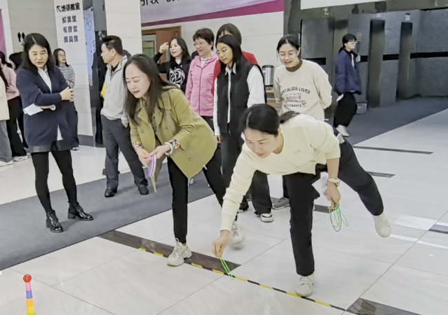 活动现场布置得温馨而富有节日氛围,处处洋溢着欢声笑语,气氛热烈而融洽,现场设置了多个趣味游戏项目,如投壶、套圈、沙包投掷、筷子夹球、团体颠球等,每一项都充满了挑战与乐趣。这些游戏项目不仅考验了参与者的技巧、细心、耐心和专注力,又注重团队合作和默契配合。