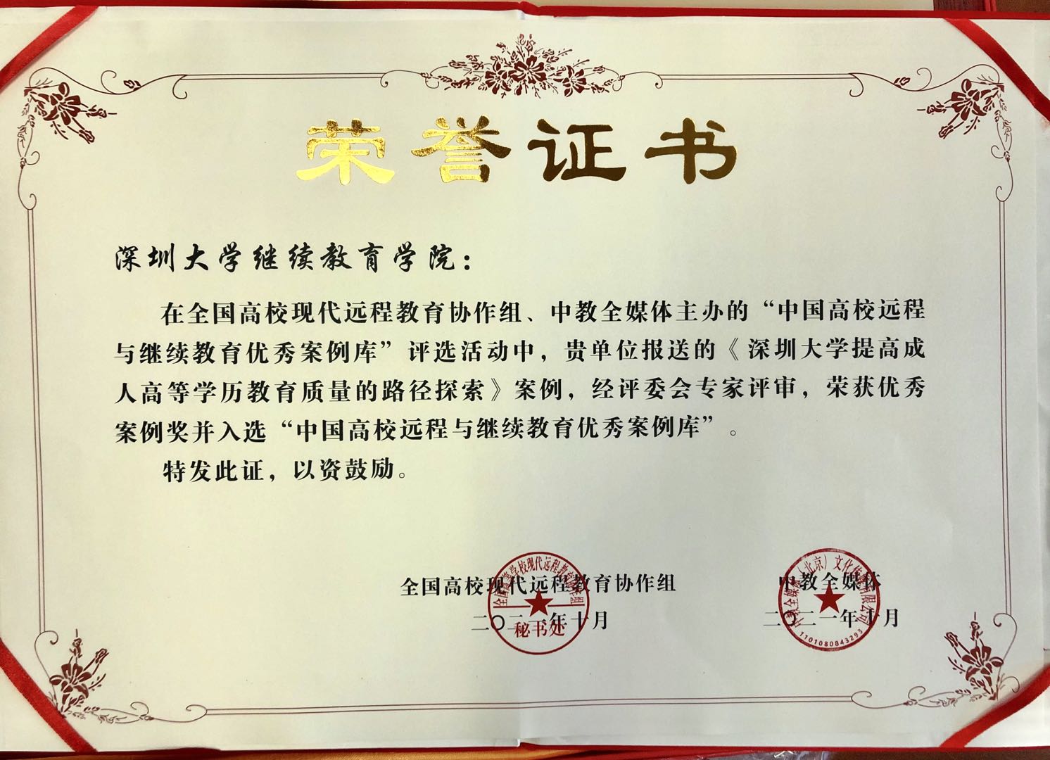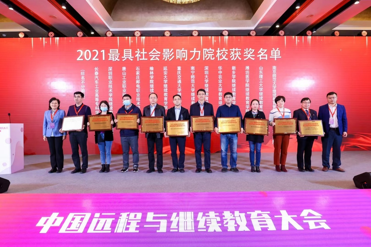 近日,2021中国远程与继续教育大会于北京落下帷幕。大会由全国高校现代远程教育协作组、中国高等教育学会继续教育分会、全国高等学校教育技术协作委员会共同指导,中教全媒体主办。大会上举行了颁奖典礼,我院荣获 “2021中国最具社会影响力院校” 称号,案例《深圳大学提高高等学历教育质量的路径探索》荣获优秀案例奖并入选“中国高校远程与继续教育优秀案例库”优秀案例名单。