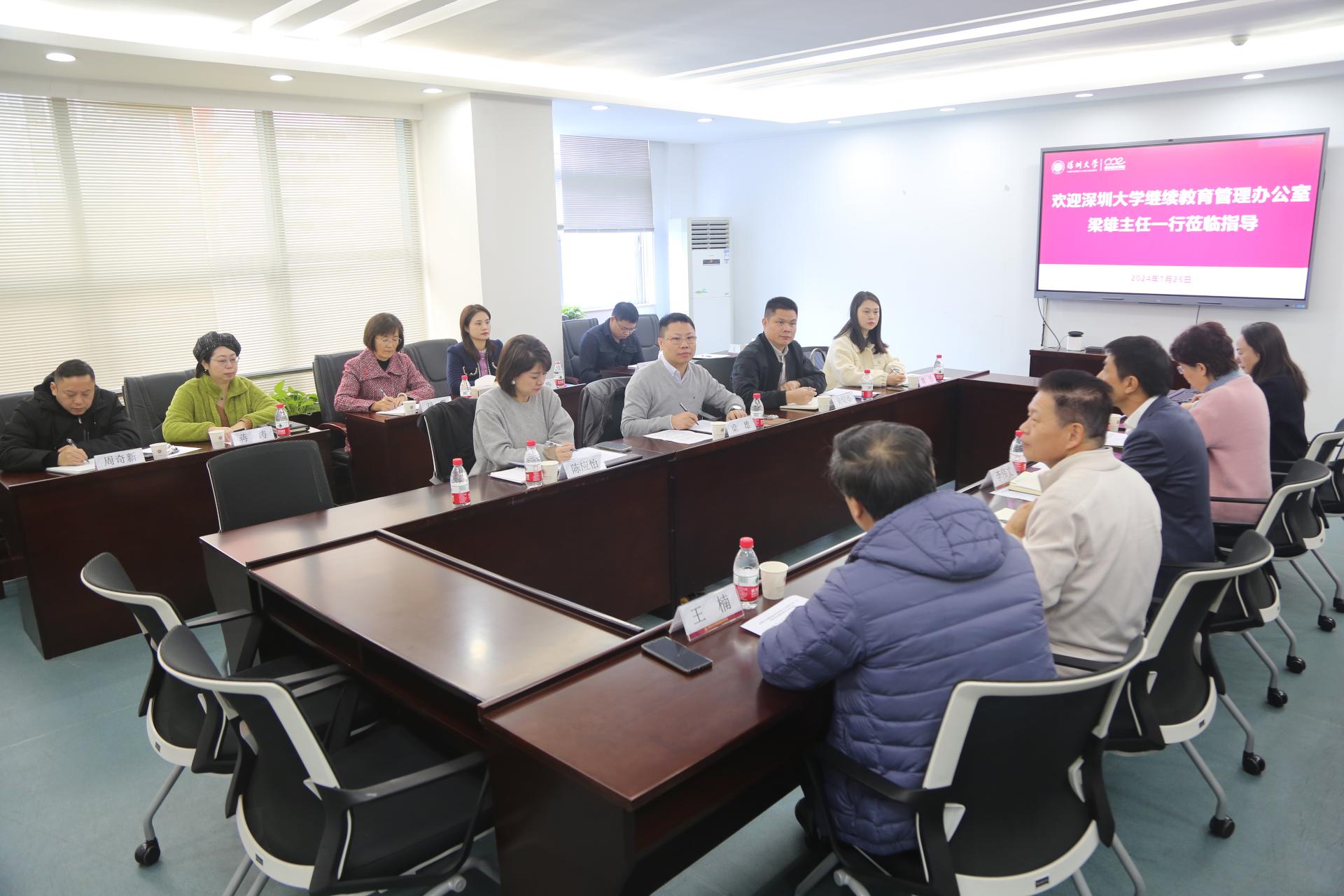 1月26日上午, 深圳大学继续教育管理办公室主任梁雄一行4人莅临我院调研交流和指导。深圳大学继续教育学院院长李伟文、书记陈志行、副院长刘子华、副院长王楠、副院长胡蓉以及学院内设部门负责人等参加调研和座谈。