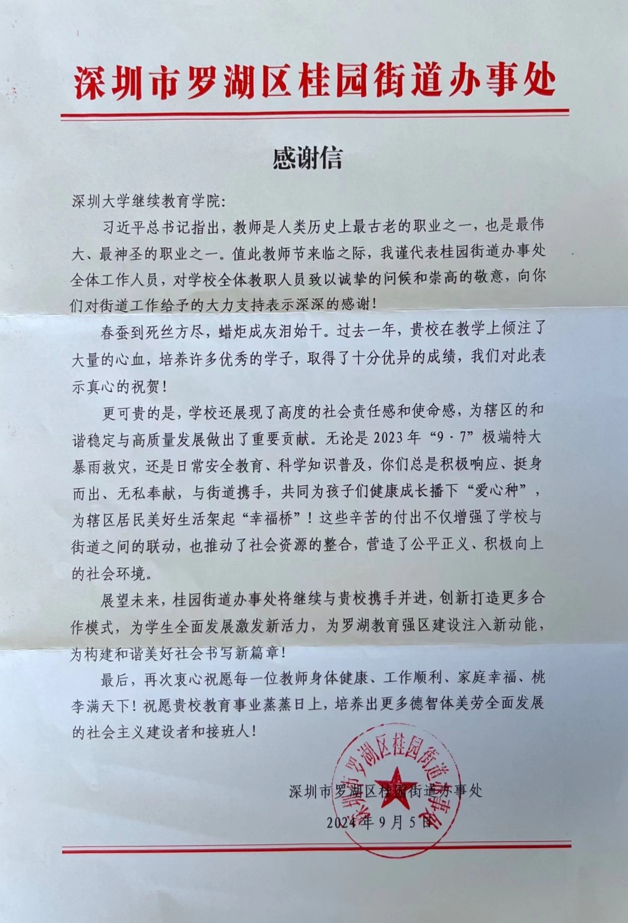 此次桂园街道办的致谢和慰问活动,是对学院工作的肯定和鼓励,不仅加深了双方之间的友好关系,也为教师节的庆祝活动增添了浓厚的氛围。学院将继续秉承服务社会、造福民众的的宗旨,不断提升教育教学质量,为社区提供更好的教育服务。同时,学院也期待与桂园街道办继续深化合作,共同为社区的发展和繁荣贡献更多的力量。