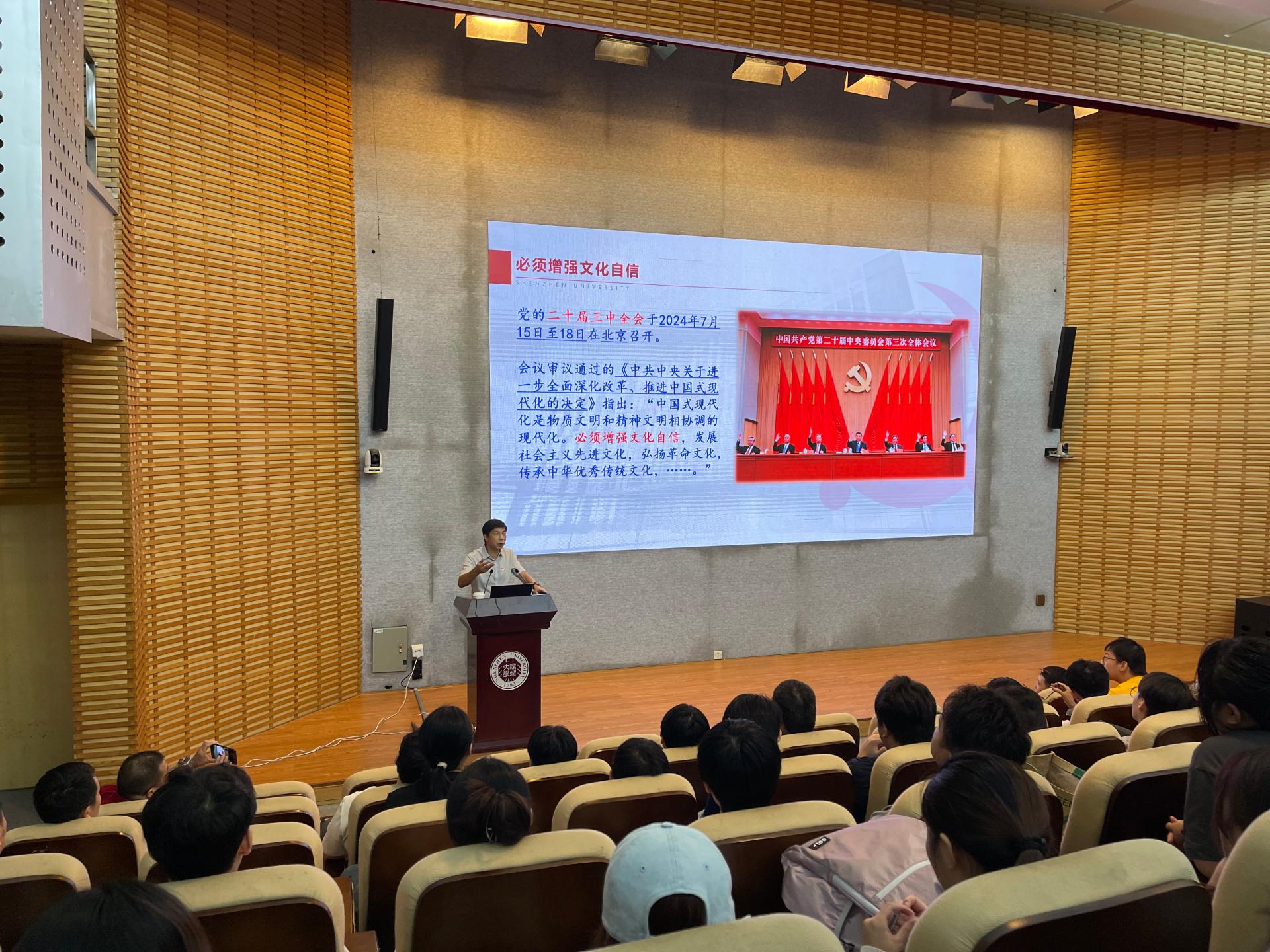 随后,李伟文院长走上讲台,为新生们带来了本次开班仪式的重头戏——“思政第一课”。他以《增强文化自信,诠释深大精神》为题,深入浅出地阐述了文化自信对于一个国家、一个民族乃至每个人的重要意义。他指出,文化自信是我们在全球化时代保持独立性和竞争力的关键所在,也是我们传承和弘扬中华优秀传统文化的重要基石。