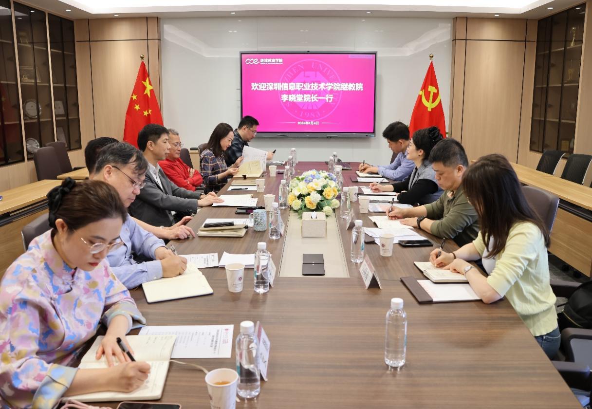 3月4日,深圳信息职业技术学院继续教育学院李晓堂院长一行4人来访我院开展调研交流活动,深圳大学继续教育学院院长李伟文、党总支书记张革华,副院长刘子华、王楠、胡蓉,以及相关部门负责人等热情接待,双方在学院A座初心楼1002会议室举行交流座谈会。