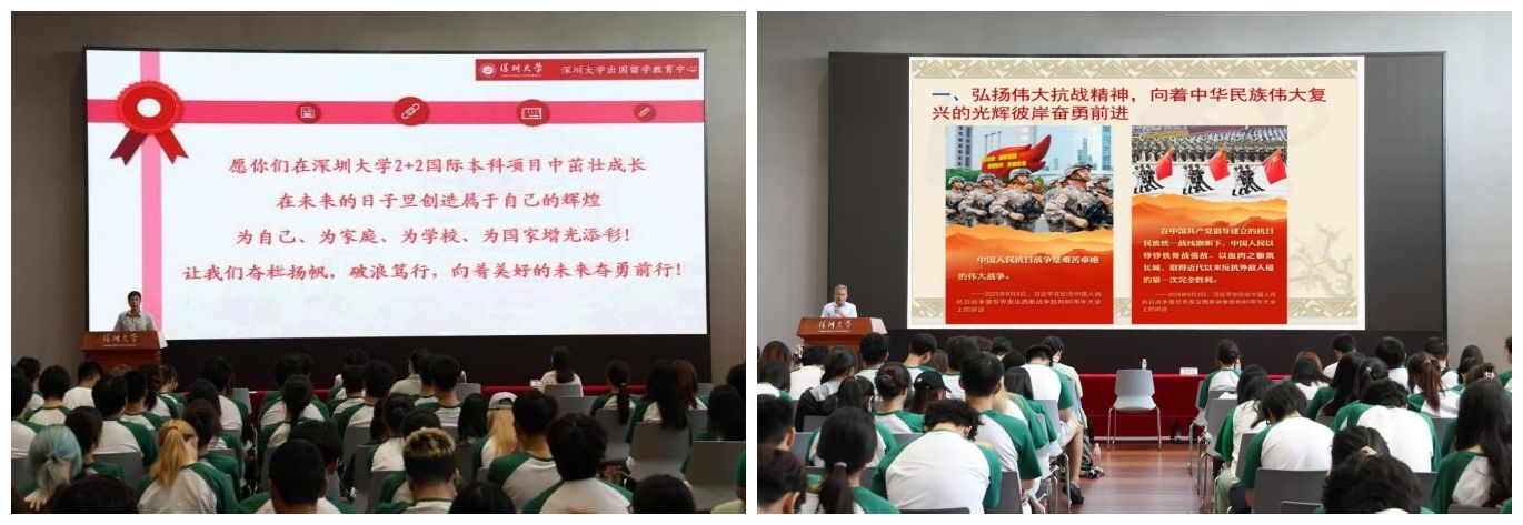 李伟文院长代表深圳大学继续教育学院及深圳大学出国留学教育中心向新生致以热烈欢迎。他指出,深圳大学2+2国际本科项目是深圳大学与教育部留学服务中心战略合作的重点项目,始终坚持思政引领、数智赋能,贯彻“三全育人”宗旨,践行“严管厚爱,不止于学”的理念,培养的学生国外学位授予率约为99.21%,其中90%以上学生国外本科毕业后继续攻读世界排名靠前的名校硕士学位。
