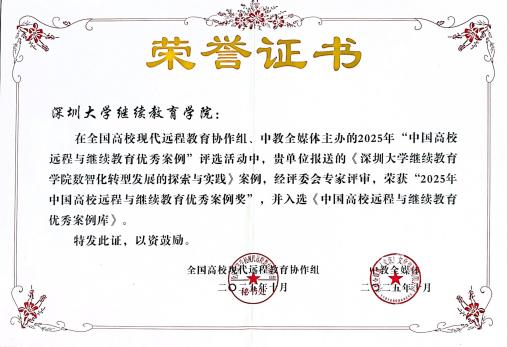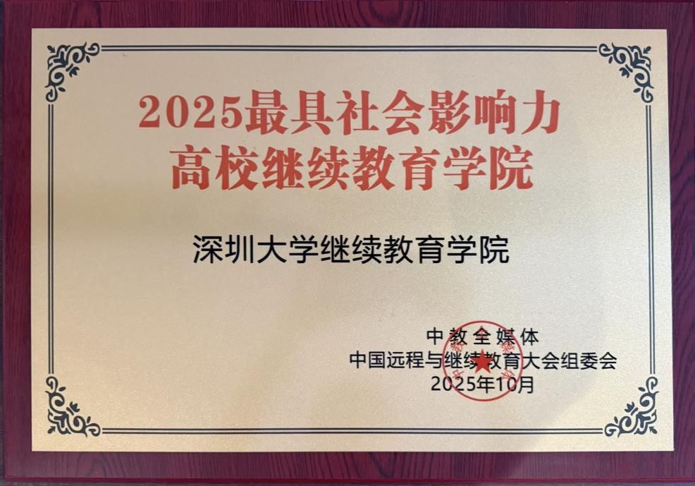 在大会颁奖典礼上,深圳大学继续教育学院荣获“2025最具社会影响力高校继续教育学院”,倾力打造的特色育人项目——《深圳大学继续教育学院数智化转型发展的探索与实践》和《立德树人与数字化转型:深圳大学高等学历继续教育的创新实践与时代担当》荣获“2025年中国高校远程与继续教育优秀案例奖”并入选《中国高校远程与继续教育优秀案例库》。