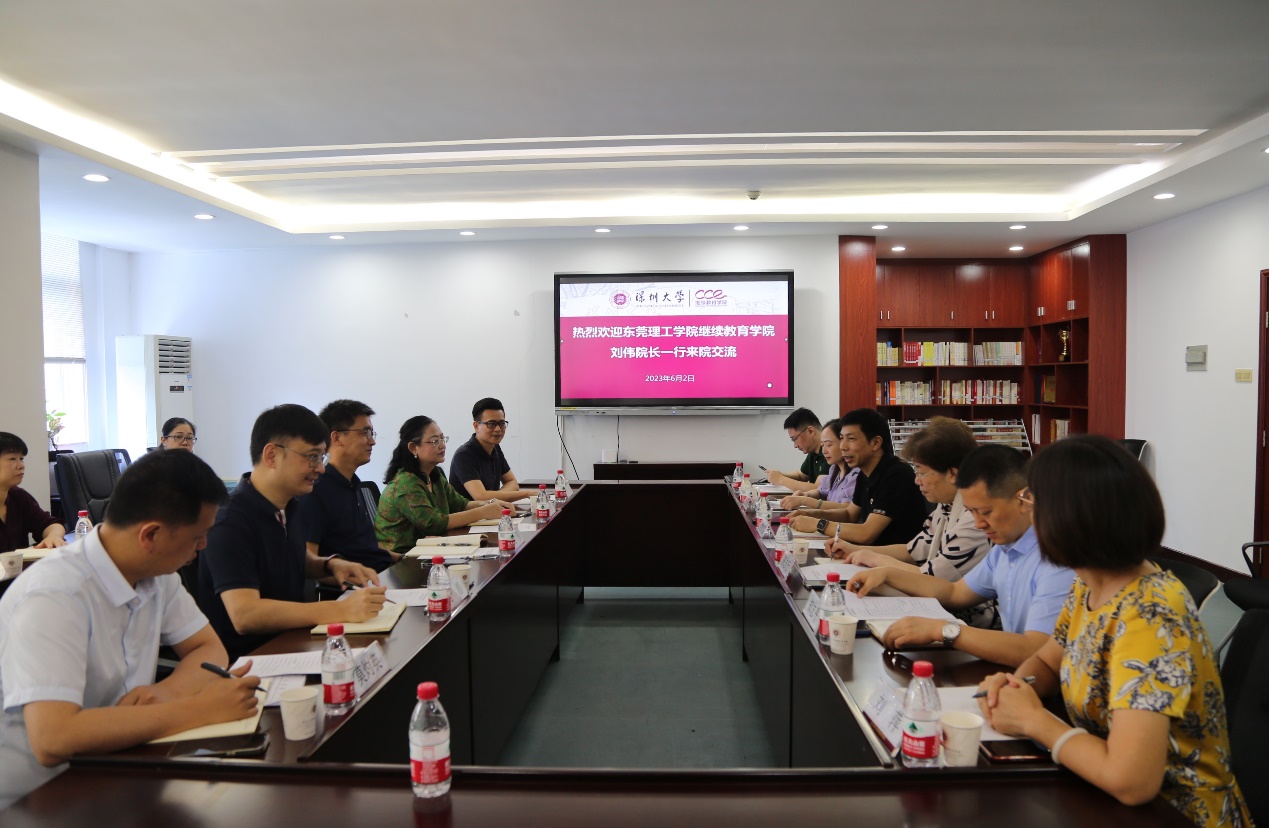 6月2日,东莞理工学院继续教育学院院长刘伟、副书记邹胜美、院长助理宁靓、陈峰一行九人来我院调研交流。深圳大学继续教育学院院长李伟文、党总支书记陈志行、副院长胡蓉、郑志平以及相关部门负责人参加调研交流。