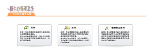 考生缴费系统下分“开单”、“支付”、“缴费状态查询”三个功能。
