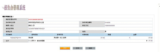 此时,考生可以选择【支付】,使用网上银行功能进行支付。也可通过【打印】,连接打印机,打印出“非税缴款通知书”前往银行柜台缴费。