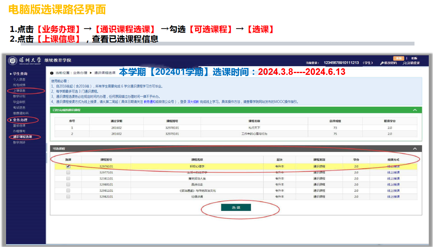 (1)电脑版:凭个人学号和密码登录深圳大学继续教育学院主页(http://cce.szu.edu.cn)→成考教务系统→“业务办理”中的“通识课程选课” →选课。