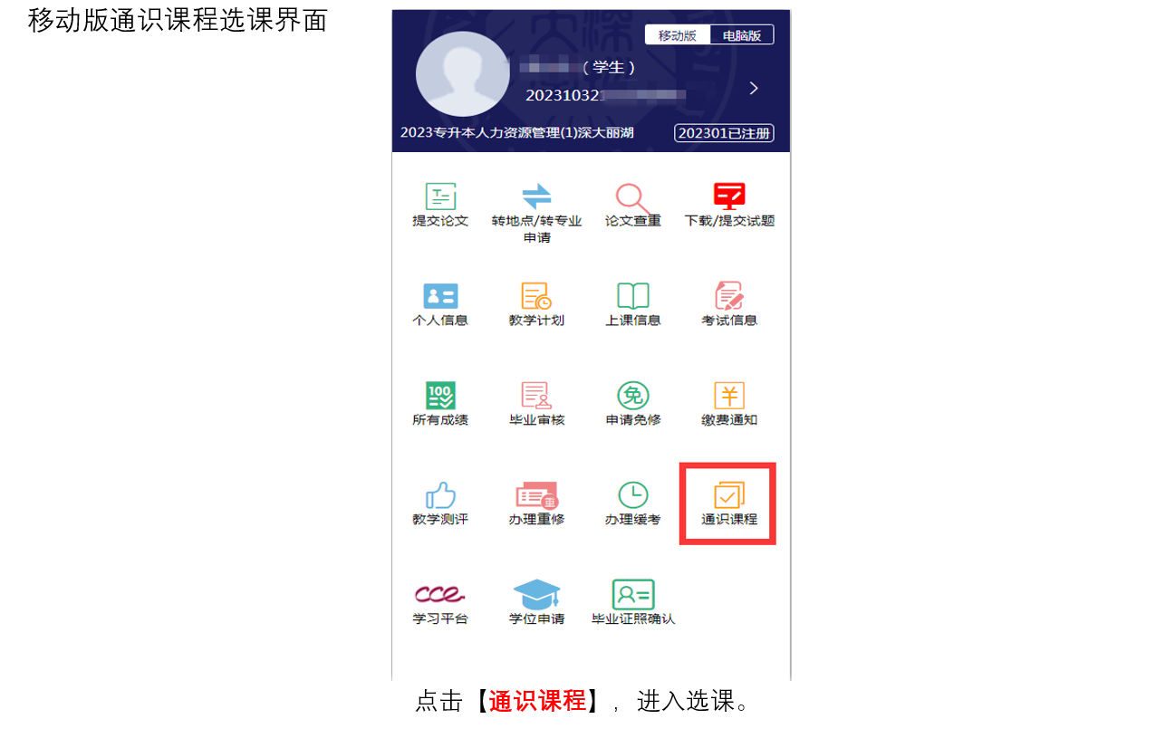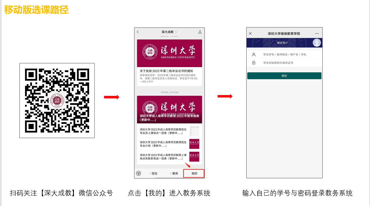 (2)移动版:关注【深大成教】微信公众号,点击【我的】进入教务系统,输入自己的学号和密码登录教务系统,点击【通识课程】,进入选课。