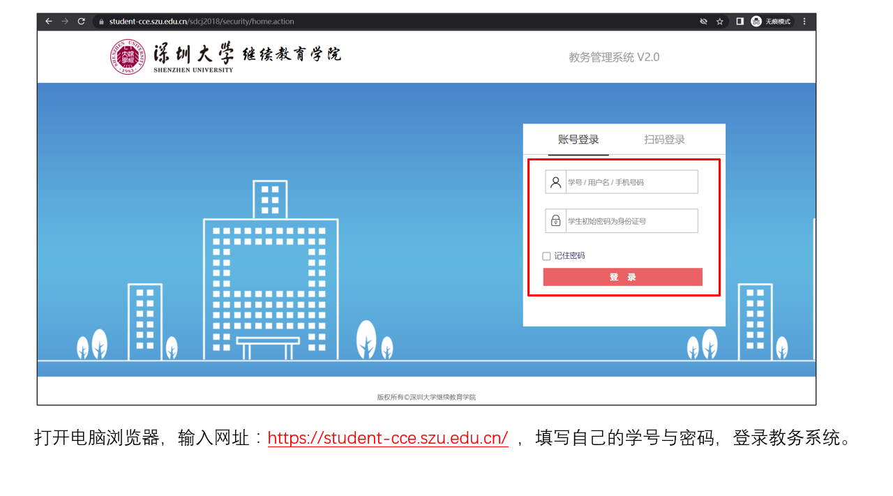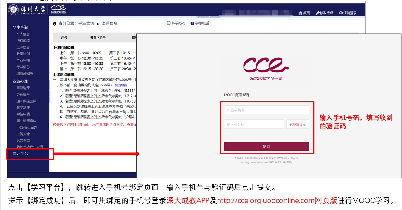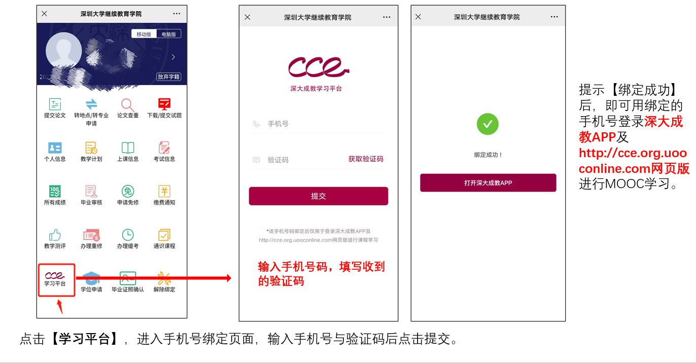 打开电脑浏览器,输入网址https://student-cce.szu.edu.cn/,填写自己的学号与密码,登录成考教务系统。点击【学习平台】,跳转进入手机号绑定页面,输入手机号与验证码后点击提交。提示【绑定成功】后,即可用绑定的手机号登录深大成教APP及http://cce.org.uooconline.com网页版进行MOOC学习。