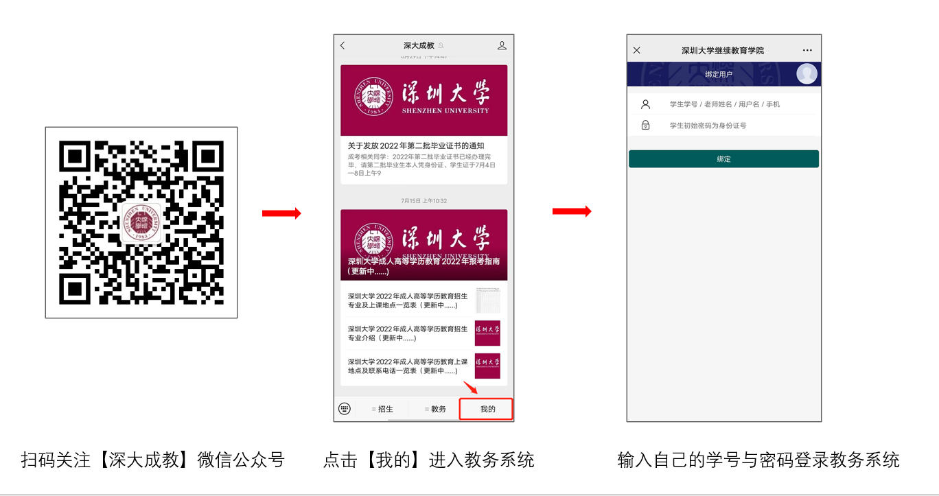 扫码关注【深大成教】微信公众号,点击【我的】进入教务系统,输入自己的学号与密码登录教务系统,点击【CCE学习平台】,进入手机号绑定页面,输入手机号与验证码后点击提交。提示【绑定成功】后,即可用绑定的手机号登录深大成教APP及http://cce.org.uooconline.com网页版进行MOOC学习