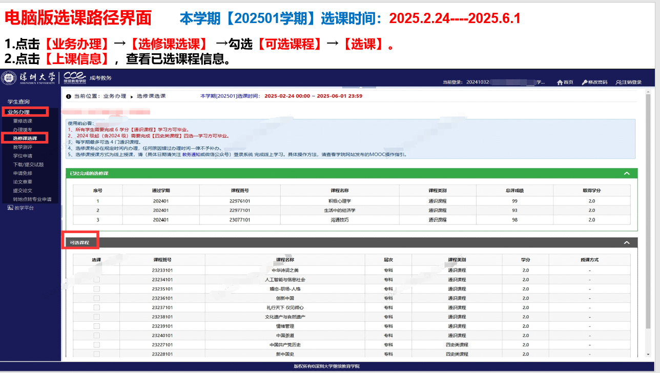 (1)电脑版:凭个人学号和密码登录深圳大学继续教育学院主页(http://cce.szu.edu.cn)→成考教务系统→“业务办理”中的“选修课程选课” →选课。