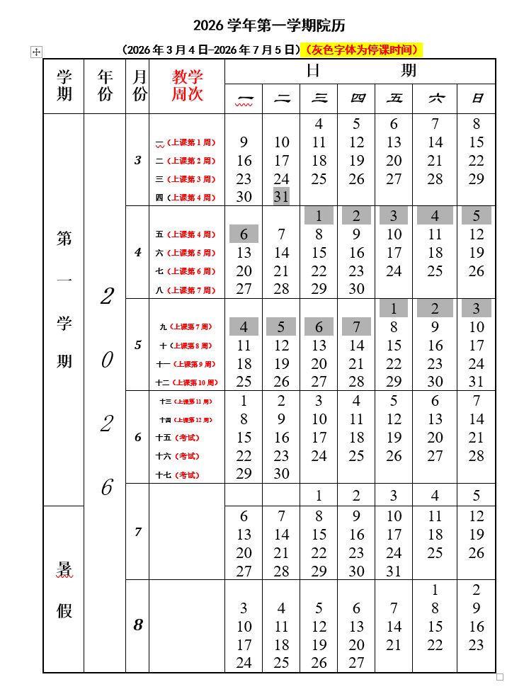 八、2026学年第一学期院历