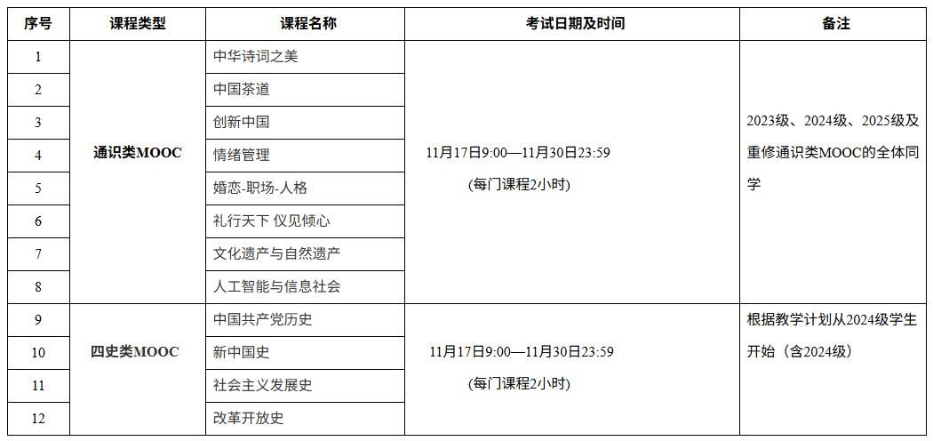 本学期通识类MOOC线上期末考试定于2025年11月17日—11月30日进行,考试科目及时间安排如下: